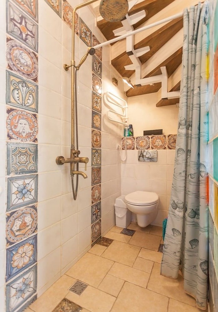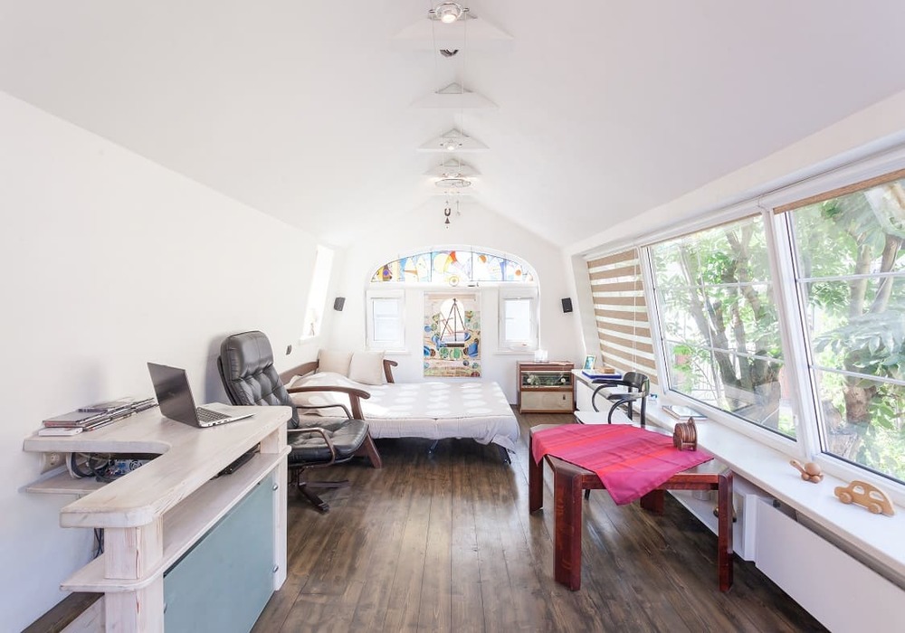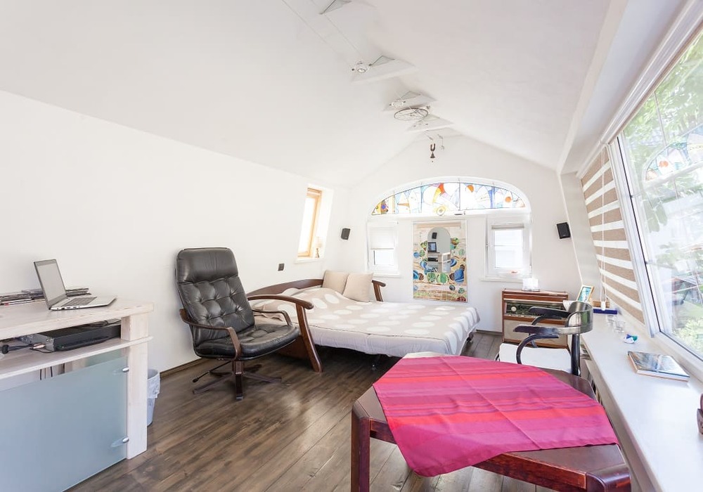 Высокая крыша, полы, лестница, мебель из натурального дерева и ясень под окном создают чувство гармонии с природой. Яркий витраж ручной работы с включениями морского стекла художника-витражиста Виталия Бадло дарит радость и настраивает на позитивные мысли даже в ненастную погоду.